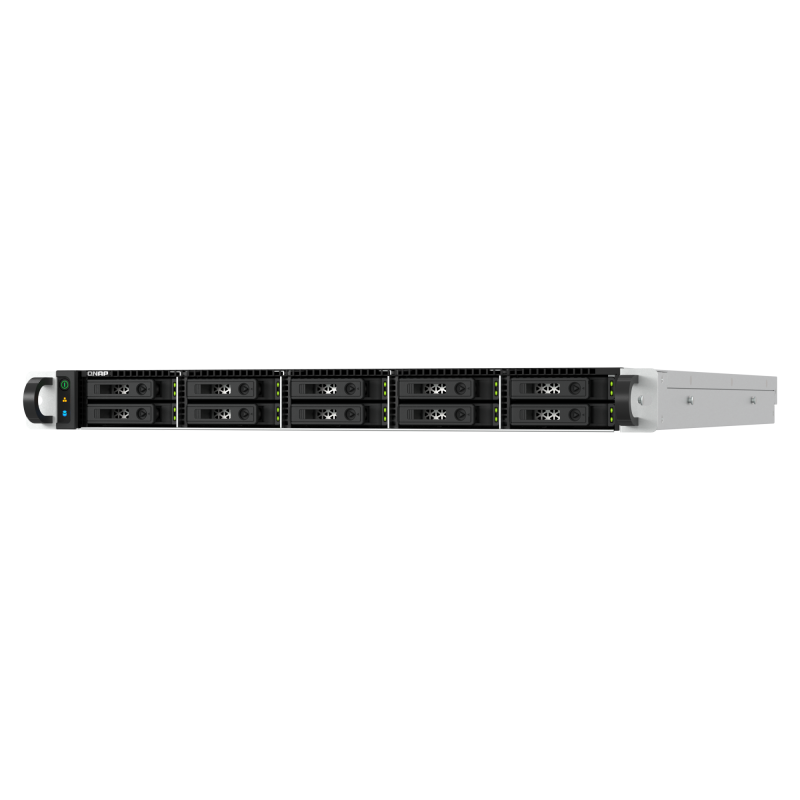 10-bay QuTS hero all-flash NAS, AMD Ryzen™ 7 7000 series 8-core / 16-thread processor (burst up to 5.3 GHz), 32 GB DDR5 ECC UDIMM (max. 192 GB), 10 x 2.5" SATA 6Gb/s Solid State Drive slots, 2 x 2.5GbE, 2 x 10GBASE-T, 4 x DDR5 UDIMM slots, USB 3.2 Gen 2 (10Gbps), 2 x PCIe Gen4 expansion slots, optional 25GbE PCIe card support, 1U rackmount chassis.