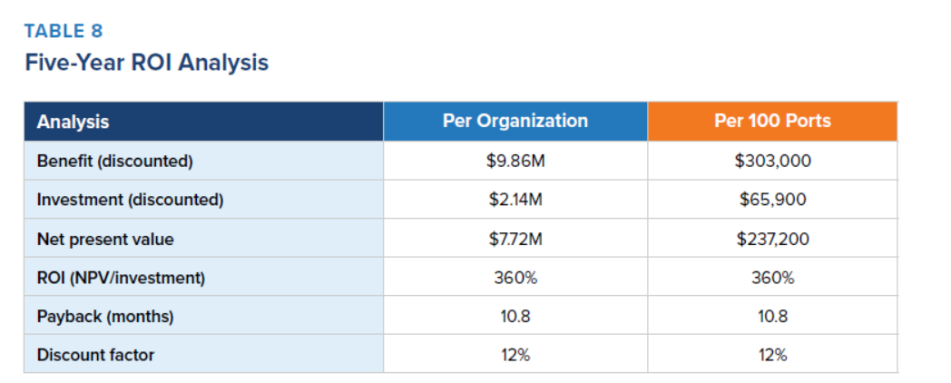 Việc cải thiện độ tin cậy và tính khả dụng của mạng đã ảnh hưởng trực tiếp đến người dùng cuối và đảm bảo hiệu suất tối ưu cho các ứng dụng và thông tin liên lạc của doanh nghiệp. Hiệu suất tốt hơn đã giúp các công ty giải quyết cơ hội kinh doanh tốt hơn. Tổng doanh thu trung bình hàng năm tích lũy được sau khi áp dụng nền tảng là 7.615.000 đô la (234.000 đô la trên 100 cổng), với chi phí hoạt động giảm hàng năm là 124.000 đô la (xem Bảng 7).